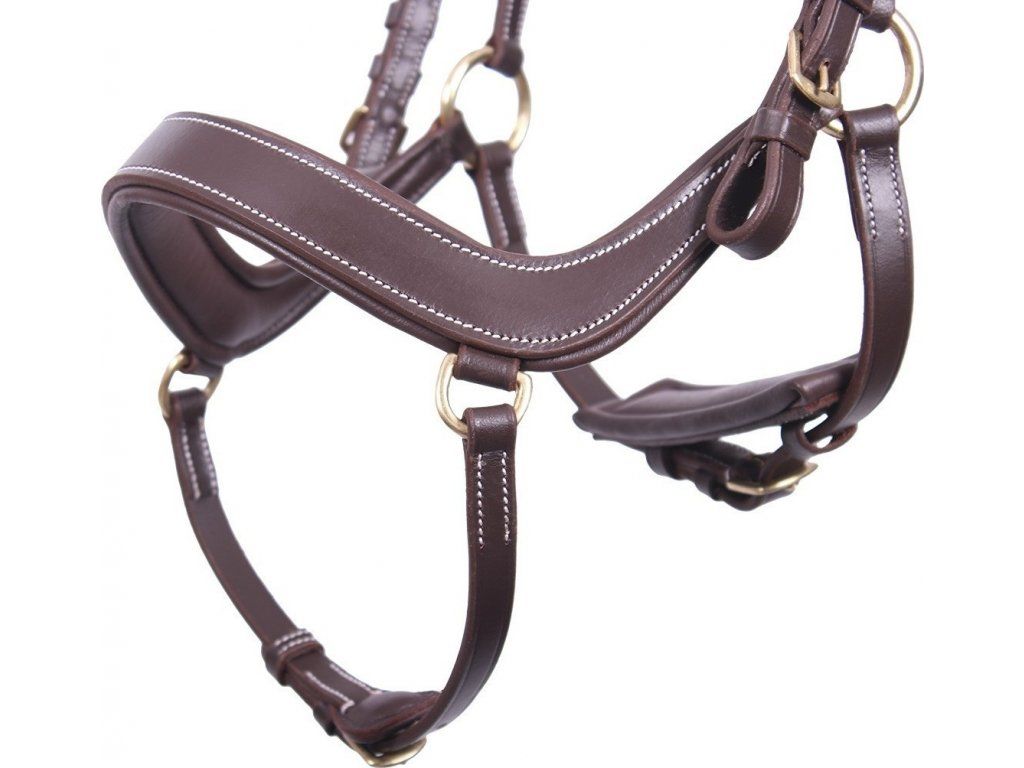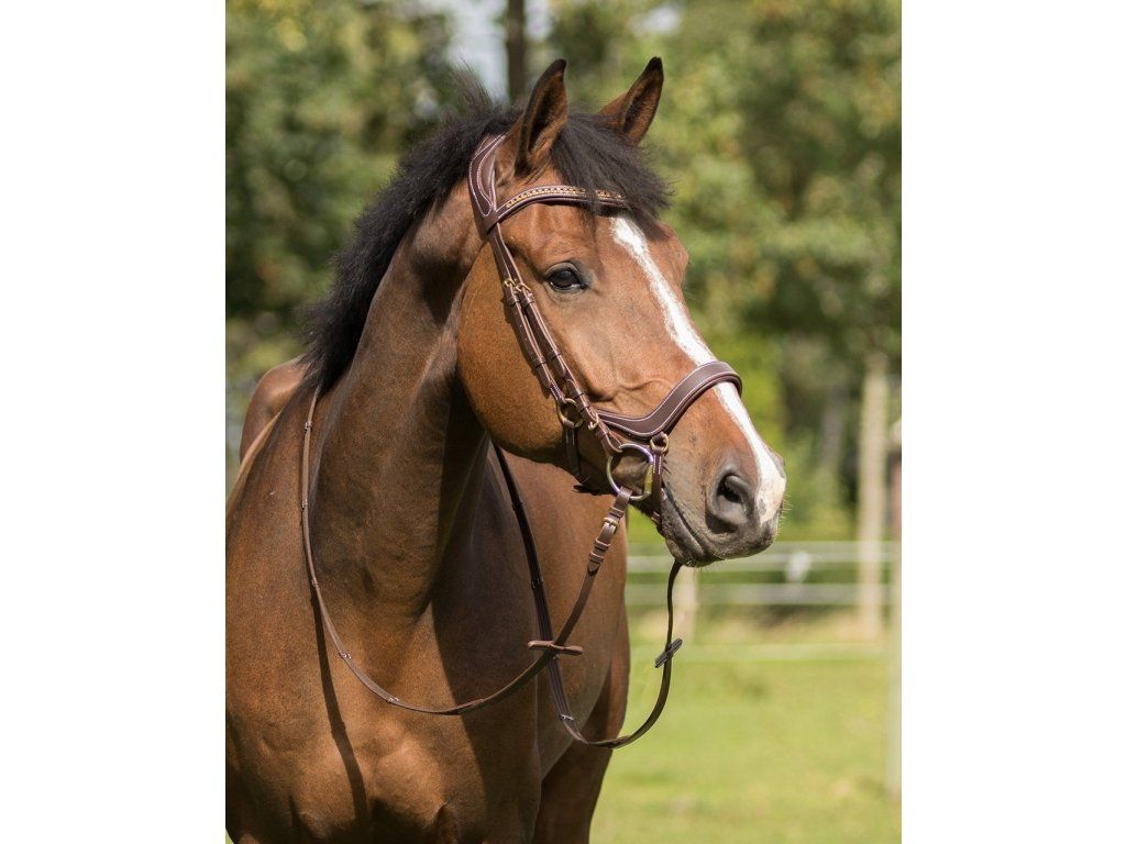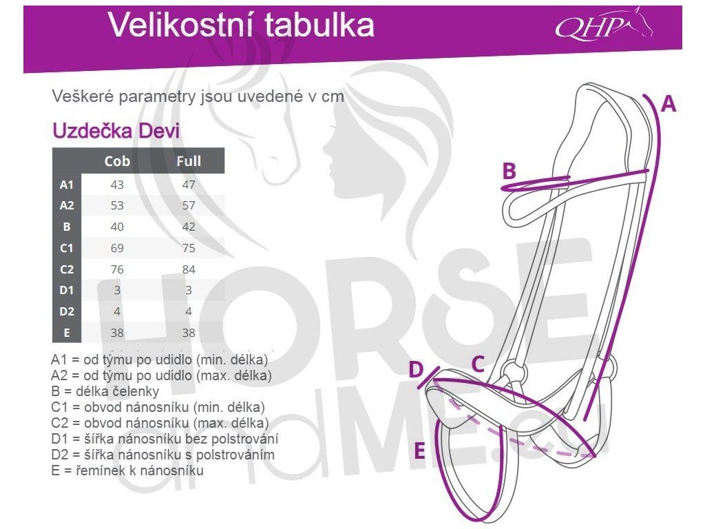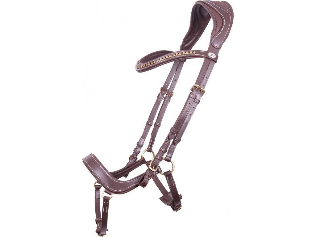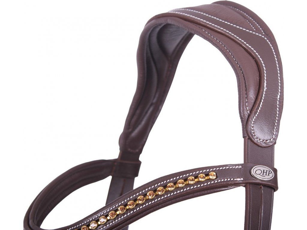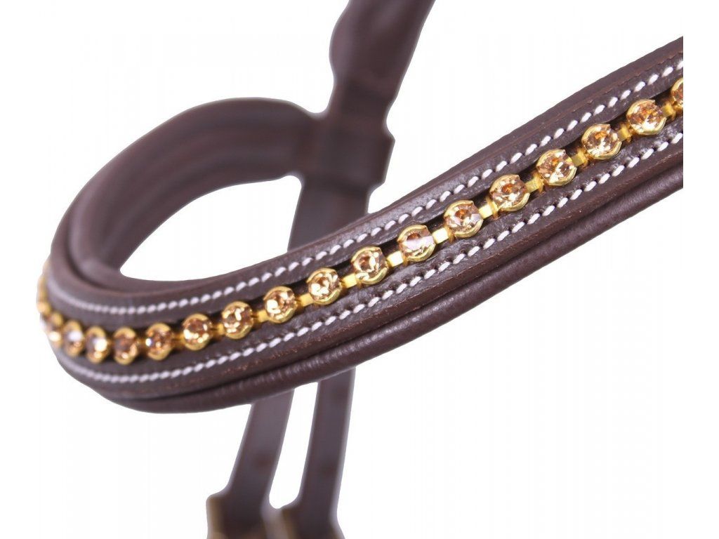 Anatomicky tvarovaná uzdečka s měkkým polstrováním, která se maximálně vyhýbá citlivým bodům hlavy koně. Díky tomu je uzdečka vhodná pro koně, kteří jsou extrémně citlivý. Speciálně navržený zakřivený tvar nánosníku zajišťuje, že leží výše na nosu a vyhýbá se citlivé spodní části. Anatomický nátylník zajišťuje maximální volnost ucha a rovnoměrně distribuuje tlak. Kromě toho netlačí na zuby koně, což zabraňuje podráždění v ústech. Uzdečka je zdobena bílým prošitím a třpytivou čelenkou ve tvaru vlnky se zlatými kamínky. Součástí balení jsou i otěže.