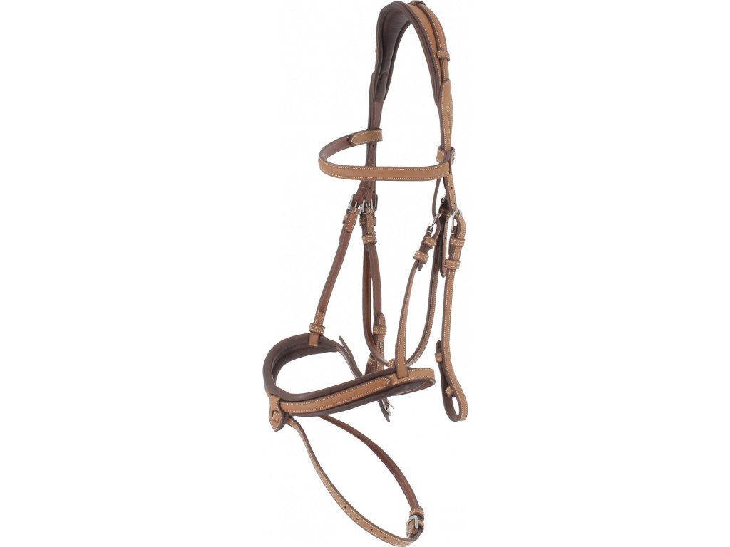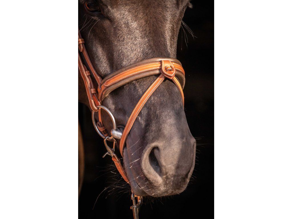 Kožená uzdečka Elegance s kontrastním krémovým prošíváním. Uzdečka má kombinovaný široký nánosník a anatomicky tvarovaný nátylník, obojí s měkkým polstrováním. Stříbrný odznak výrobce je připevněn na levé straně čelenky. Je dodávána včetně otěží vyrobených z kombinace kůže a gumy.