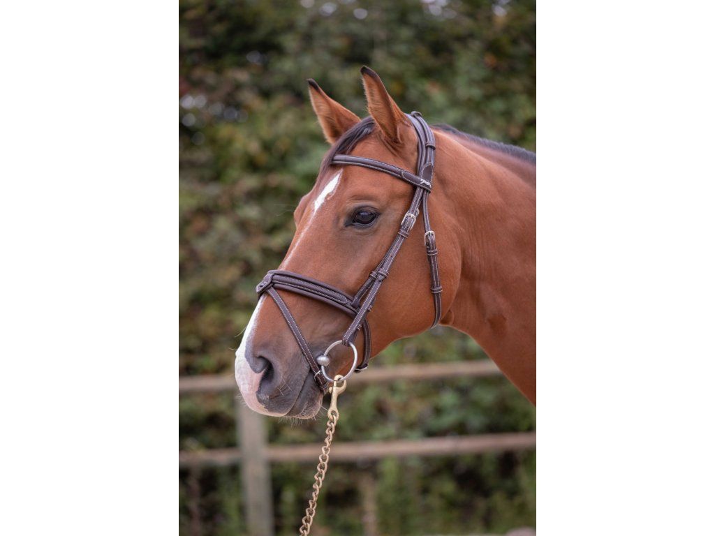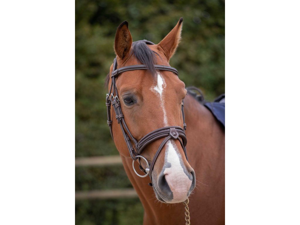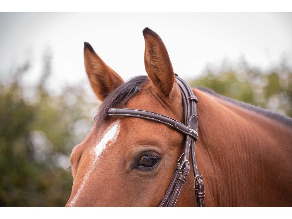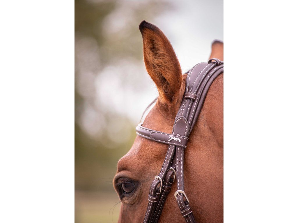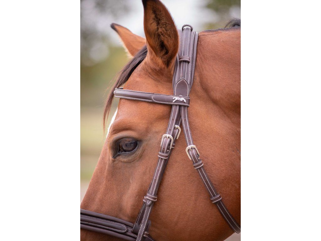 Kožená uzdečka Elegance s kontrastním krémovým prošíváním. Uzdečka má kombinovaný široký nánosník a anatomicky tvarovaný nátylník, obojí s měkkým polstrováním. Stříbrný odznak výrobce je připevněn na levé straně čelenky. Je dodávána včetně otěží vyrobených z kombinace kůže a gumy.