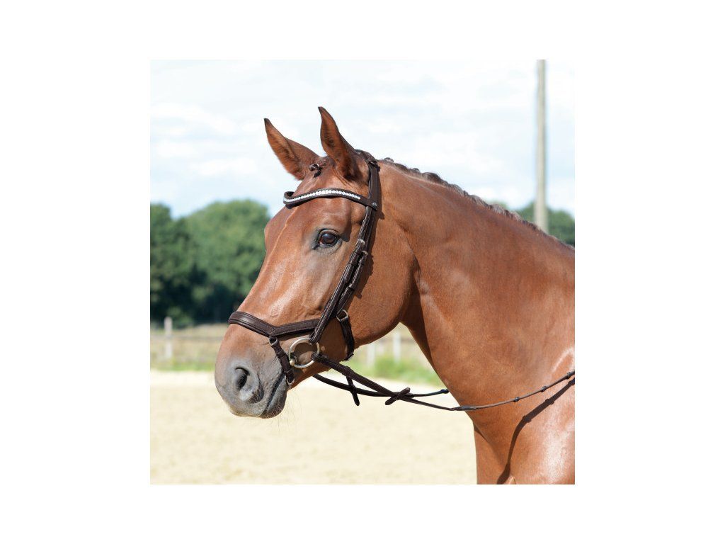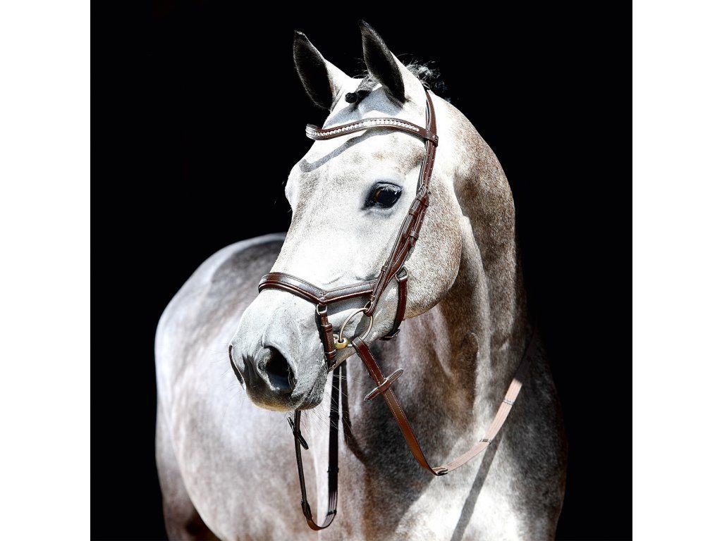 Elegantní a propracovaná anatomická uzdečka. Speciální konstrukce drží uzdečku na svém místě - nikam se nekroutí a nehrne. Anatomicky řešený nánosník, který eliminuje tlak na ty nejcitlivější oblasti koňské hlavy a pomáhá držet udidlo ve stabilní pozici. Nátylník je dělený a s možností úpravy délky za ušima - díky tomu lze docílit perfektní pozice nátylníku bez tlaku na citlivé body. Velký rozsah pro nastavení velikosti. Vyrobená z měkké kůže s nylonovou vložkou, díky čemuž je obzvláště pružná, měkká a lehká. Zakřivená, jemně zdobená čelanka třpytivými kamínky. Dodávaná včetně otěží.