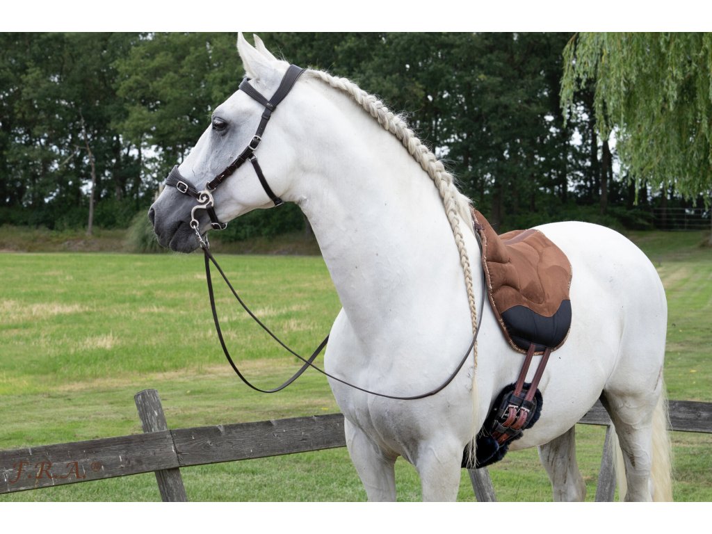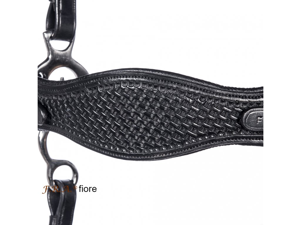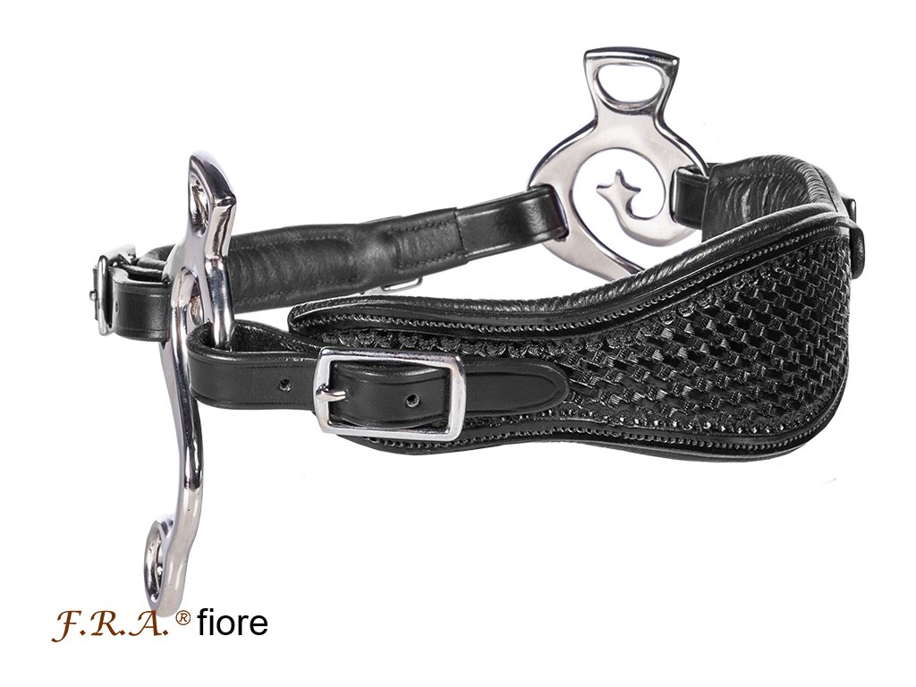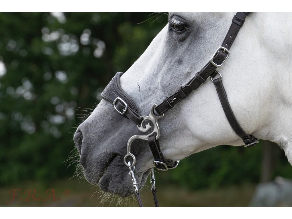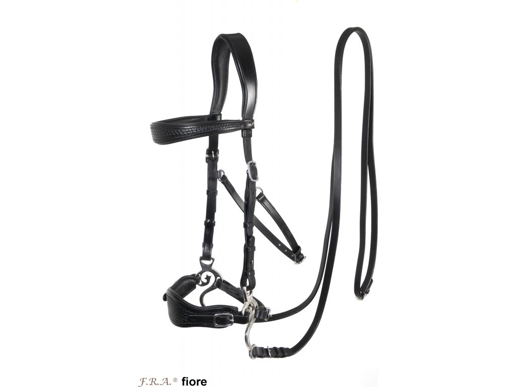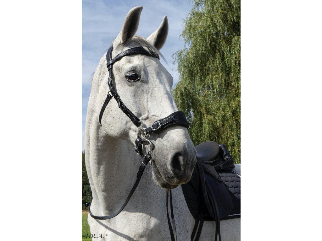 Kvalitní komplet bezudidlové kožené uzdečky a hackamore od značky F.R.A., která má anatomický tvar a je speciálně sestavena tak, aby se nepřetáčela a zůstala na správném místě. Uzdečka je vybavena měkkým polstrováním. Nemá typický podhrdelník, ale disponuje tzv. balančním řemenem, který je umístěn níže než klasické podhrdelníky, tím dochází ke zvýšení stability uzdečky a zvýšení komfortu pro koně. Uzdečka je zdobena prvky vroubkování v oblasti nánosníku a čelenky. Dodáváno s otěžemi, otěže lze přezkou na konci rozdělit. V rámci bezudidlového diagramu F.R.A. spadá pod číslo 2.