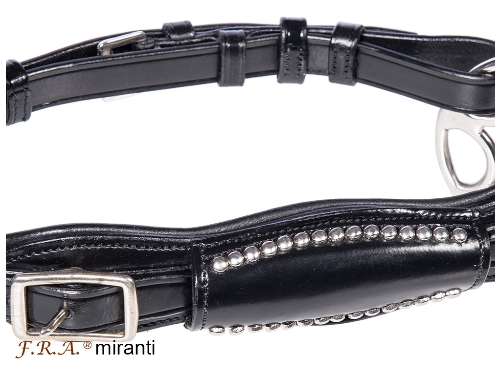 Kvalitní komplet bezudidlové kožené uzdečky a hackamore od značky F.R.A. z Nizozemí. Tato uzdečka má anatomický tvar a je speciálně sestavena, tak aby se nepřetáčela a zůstala na správném místě. Uzdečka je vybavena měkkým polstrováním. Disponuje širokým nánosníkem, který je zdoben stříbrnými cvočky. Nemá typický podhrdelník, ale disponuje tzv. balančním řemenem, který je umístěn níže než klasické podhrdelníky, tím dochází ke zvýšení stability uzdečky a zvýšení komfortu pro koně. Uzdečka je dostupná pouze v univerzální velikosti, jelikož je rozpětí úprav uzdečky velice široké, je ale vhodná zejména pro cob a full. V rámci bezudidlového diagramu F.R.A. spadá pod číslo 2.
