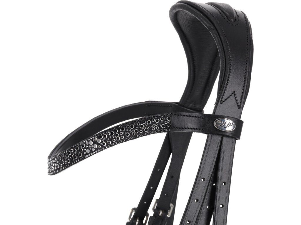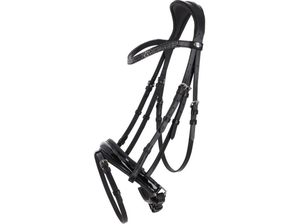 Anatomicky tvarovaná uzdečka se švédským lakovaným nánosníkem spojuje styl s maximálním komfortem pro koně. Čelenka je zdobená velkými i malými kamínky, které jemně září a dodávají uzdečce elegantní vzhled. Měkké polstrování v oblasti nánosníku a nátylniku zajišťuje pohodlí a snižuje tlak při nošení. Uzdečka je vybavena měkkým podbradníkem a oboustranně nastavitelným podhrdelníkem a dodává se s odpovídajícími otěžemi.