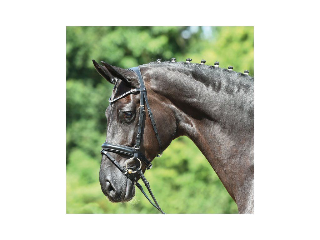 Krásná a funkční uzdečka z nejlepší italské kůže. Anatomicky střižený, měkce polstrovaný široký nátylník pro optimální rozložení tlaku. Anglický kombinovaný nánosník je dostatečně široký a polstrovaný. Čelenka je vyrobená ze zářivě bílých krystalových kamínků. Kování je z vysoce kvalitní nerezové oceli. Dodáváno bez otěží.