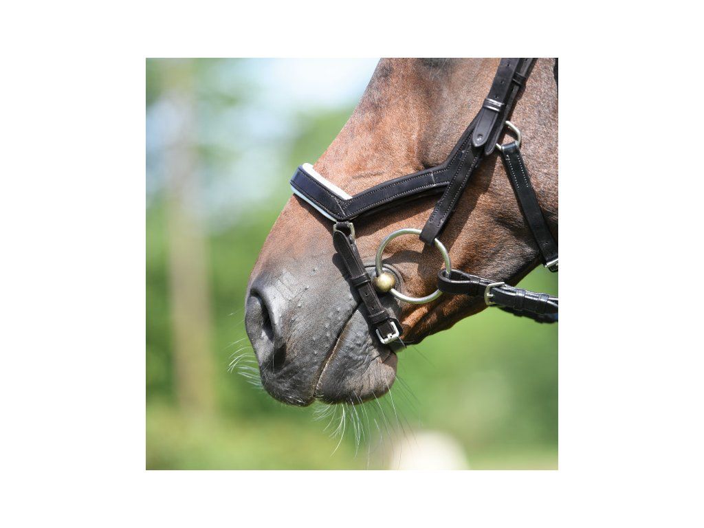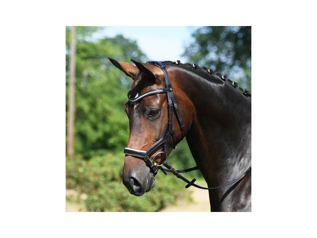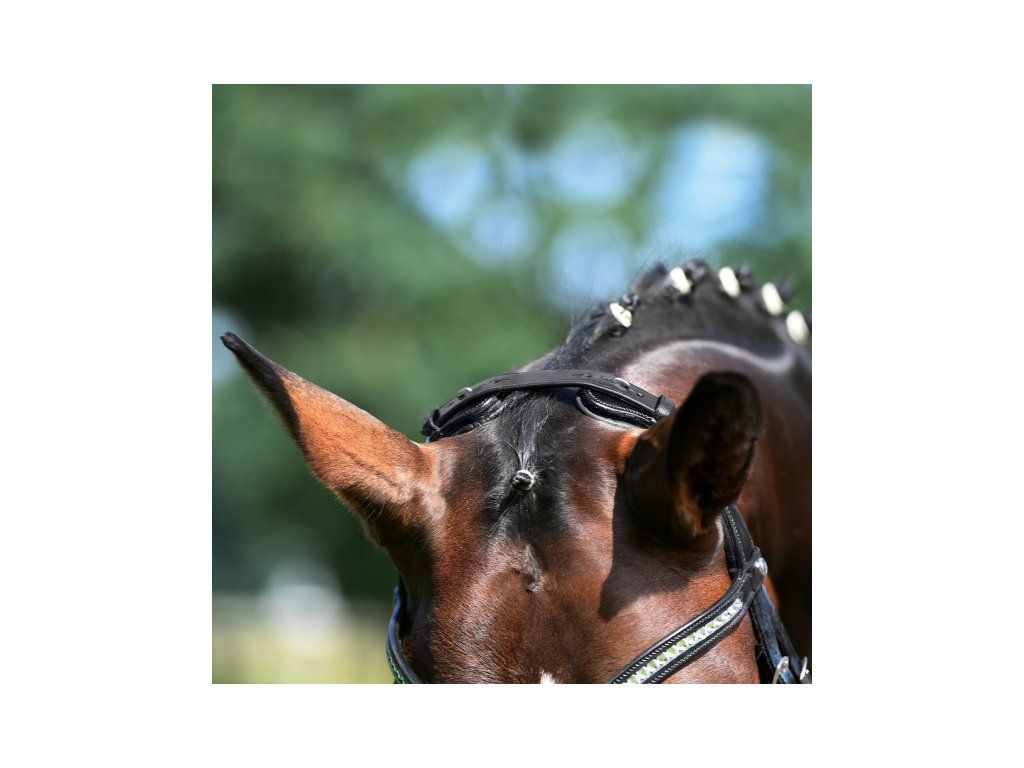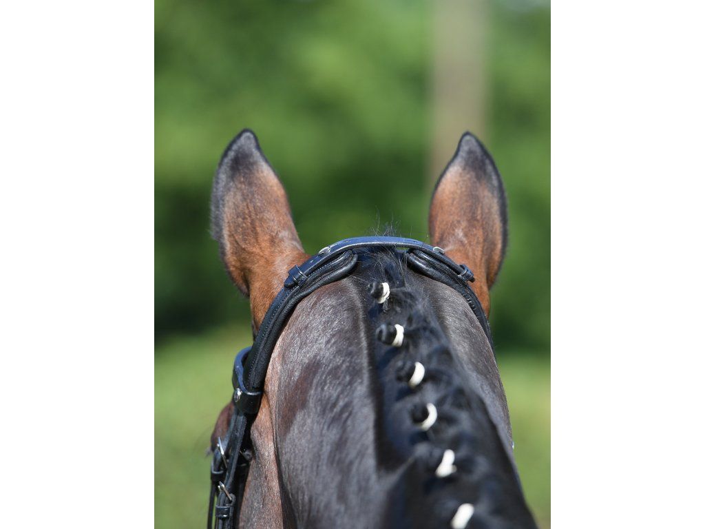 Nejmodernější vysoce kvalitní anatomická uzdečka vyrobená z nejlepší italské kůže. Speciální konstrukce drží uzdečku na svém místě - nikam se nekroutí a nehrne. Anatomicky řešený nánosník, který eliminuje tlak na ty nejcitlivější oblasti koňské hlavy a pomáhá držet udidlo ve stabilní pozici. Nátylník je dělený a s možností úpravy délky za ušima - díky tomu lze docílit perfektní pozice nátylníku bez tlaku na citlivé body. Velký rozsah pro nastavení velikosti. Zakřivená, jemně zdobená čelenka třpytivými kamínky. Dodávaná bez otěží.