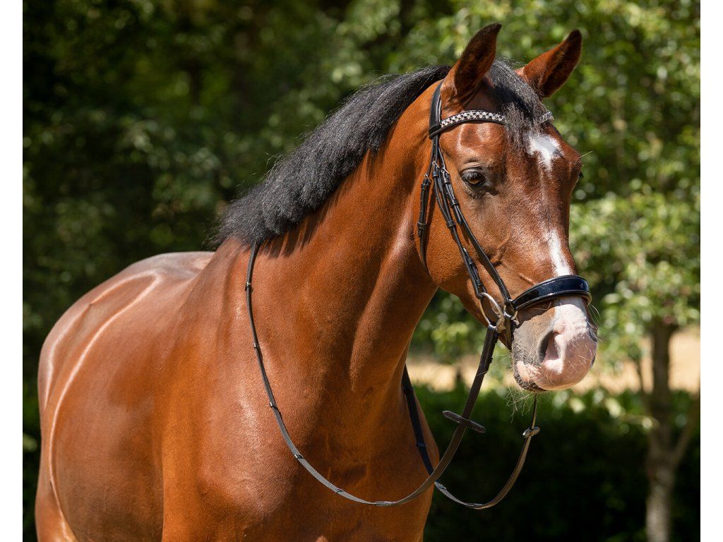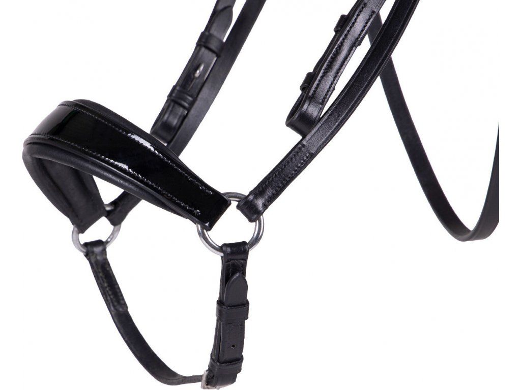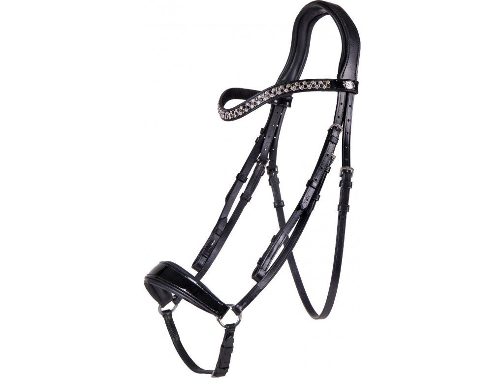 Anatomicky tvarovaná uzdečka vyrobena z vysoce kvalitní kůže. Opatřena je hannoverským nánosníkem, který zajišťuje stabilnější polohu udidla v hubě koně. Nánosník společně s nátylníkem jsou měkce polstrované pro maximální komfort. Čelenka má tvar vlny a je zdobena třpytivými kamínky ve stříbrné, šedé a černé barvě. Nánosník s čelenkou jsou vyrobeny z lesklé lakované kůže, která dodává vysoce elegantní vzhled. Uzdečka je dodávána včetně otěží.