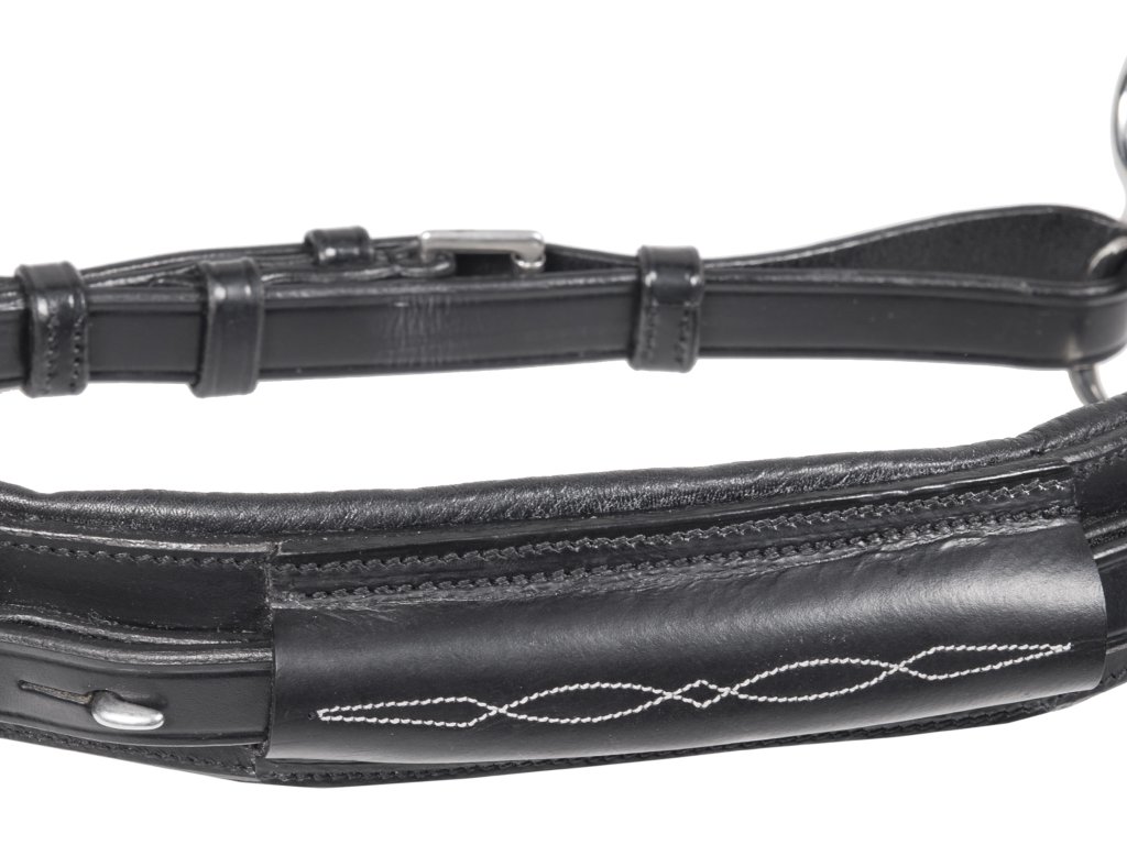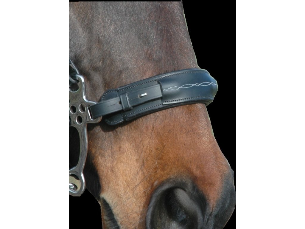 Bezudidlová kožená uzdečka s hackamore (od značky F.R.A.). Nátylník uzdečky je rovný a měkce polstrovaný. Nátylník je zakončen kroužky, za které jsou upěvněny lícnice, to zabraňuje sklouzávání lícnic k očím. Hackamore umožňuje nástavení inzentity působení dle Vaší potřeby - od sidepull až k pákovému efektu. Nánosník je měkce polstrovaný a je zdoben kontrastním prošíváním. Tato uzdečka může být skvělým pomocníkem při budování jasné a kultivované komunikace mezi jezdcem a koněm. Uzdečka je vyráběna v univerzální velikosti, která je vhodná zejména pro velikosti cob a full. Dodáváno s hackamore. V rámci bezudidlového diagramu F.R.A. spadá pod číslo 2.