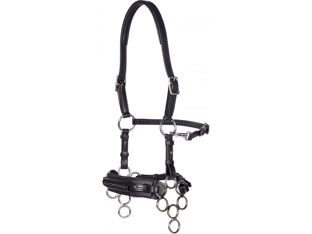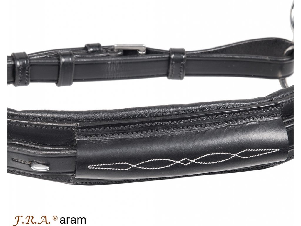 Bezudidlová kožená uzdečka s hackamore (od značky F.R.A.). Nátylník uzdečky je rovný a měkce polstrovaný. Nátylník je zakončen kroužky, za které jsou upěvněny lícnice, to zabraňuje sklouzávání lícnic k očím. Hackamore umožňuje nástavení inzentity působení dle Vaší potřeby - od sidepull až k pákovému efektu. Nánosník je měkce polstrovaný a je zdoben kontrastním prošíváním. Tato uzdečka může být skvělým pomocníkem při budování jasné a kultivované komunikace mezi jezdcem a koněm. Uzdečka je vyráběna v univerzální velikosti, která je vhodná zejména pro velikosti cob a full. Dodáváno s hackamore. V rámci bezudidlového diagramu F.R.A. spadá pod číslo 2.