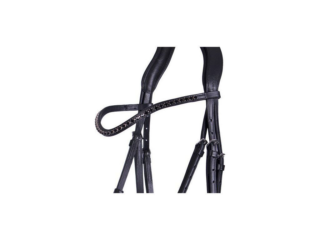 Luxusní kožená uzdečka se švédským kombinovaným nánosníkem. Má měkce polstrovaný a anatomicky tvarovaný nánosník a nátylník. Tenká čelenka, ve tvaru vlny, zdobena lesklými černými kamínky. Kování je z nerezové oceli a je dodávána včetně otěží.