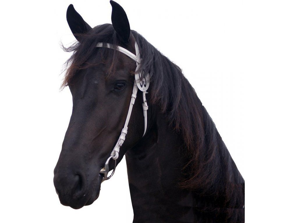 Bílá kožená uzdečka bez nánosníku. Vhodná k předvádění koní na soutěžích. Vyrobena ze stříbrných nerezových součástí.