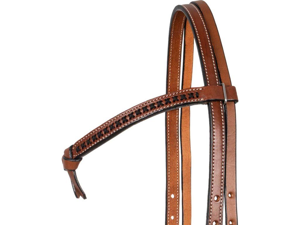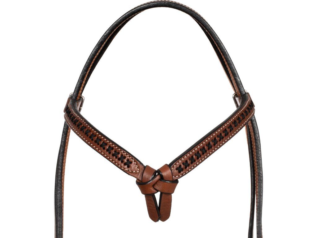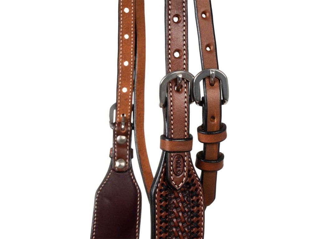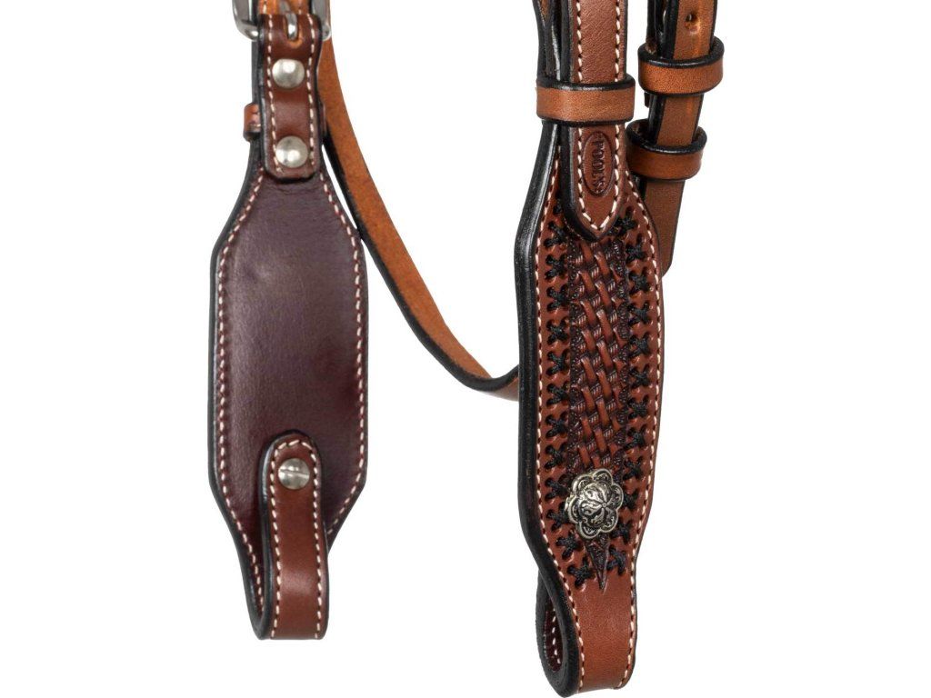 Westernová uzdečka vyrobená z vysoce kvalitní kůže. Vybavená nastavitelnými lícnicemi a podhrdelníkem. Zdobená basket vzorem, křížkovým prošíváním a uzlem na čelence.