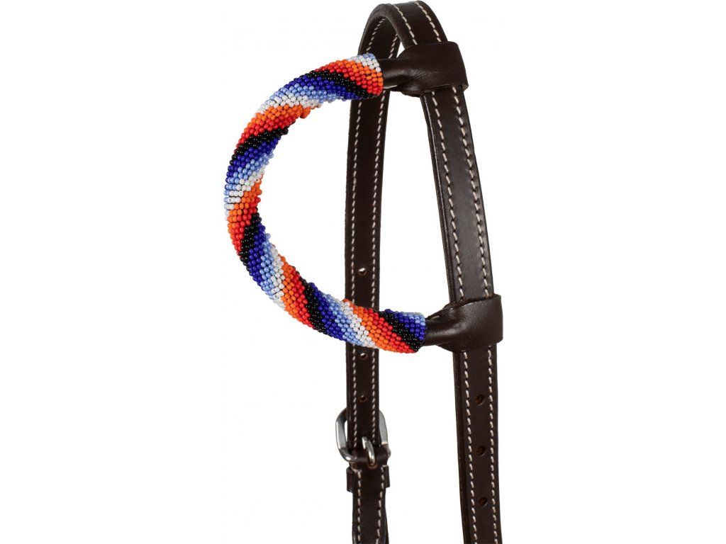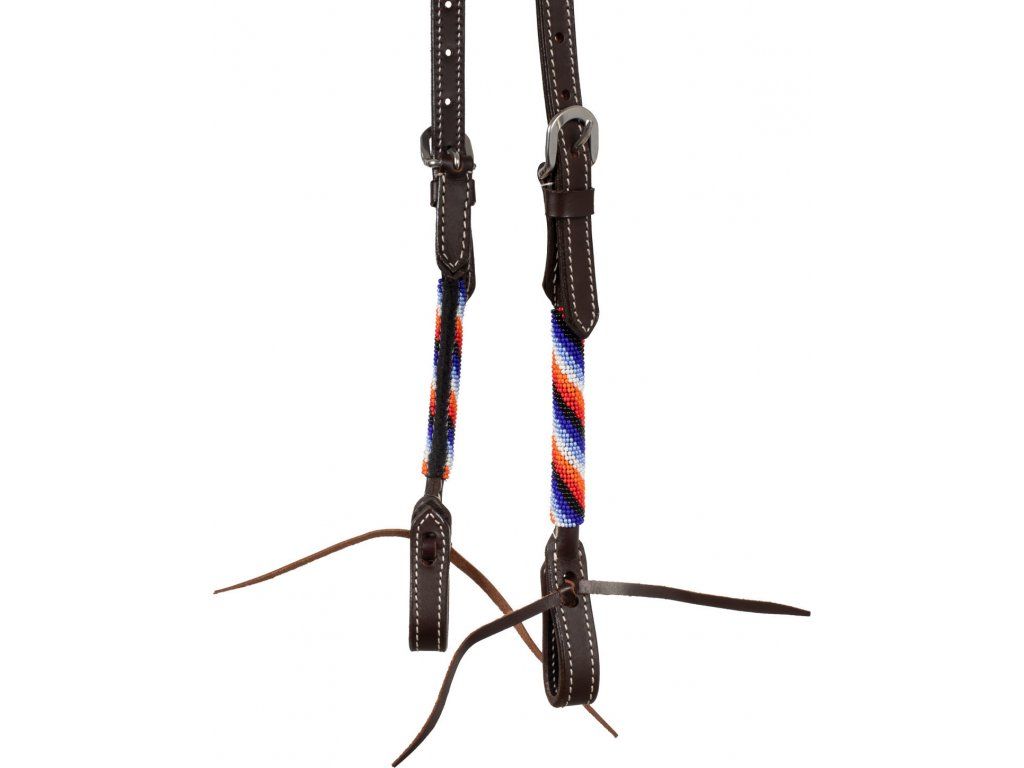 Vysoce kvalitní westernová jednouška vyrobená z měkké kůže. Vybavená přezkami z nerezové oceli. Zdobená barevnou dekorací z korálků na lícnicích a kolem ucha. Nastavitelná z obou stran. Dostupná v jedné univerzální velikosti.