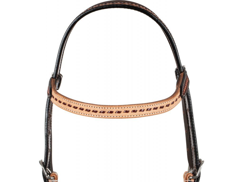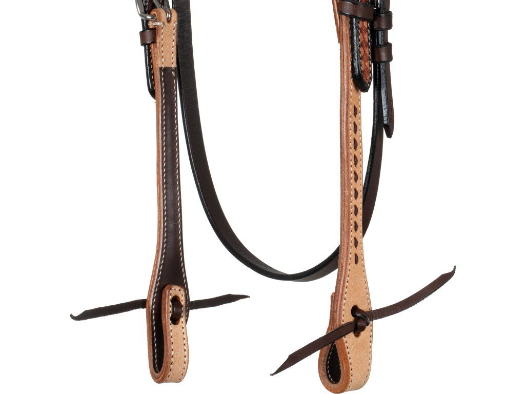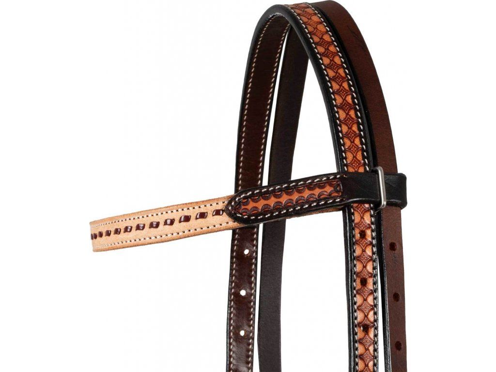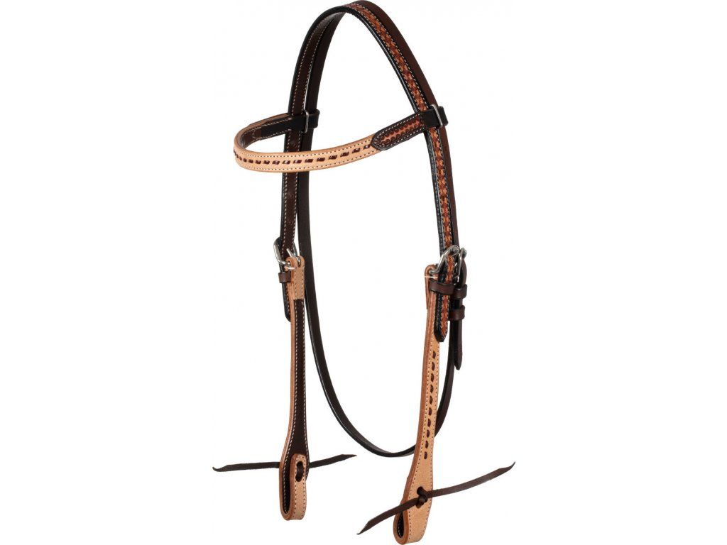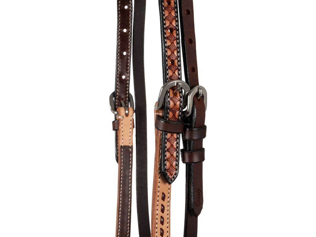 Westernová uzdečka s klasickou rovnou čelenkou. Vyrobena z velmi kvalitní kůže v přírodní barvě. Uzdečka zaujme poutavým vzorem, který je doplněn tmavě hnědým zbarvením. Kování z nerezové oceli s klasickým zapínáním na kožené řemínky. K dispozici v jedné velikosti, která odpovídá QH. Nastavitené lícnice.