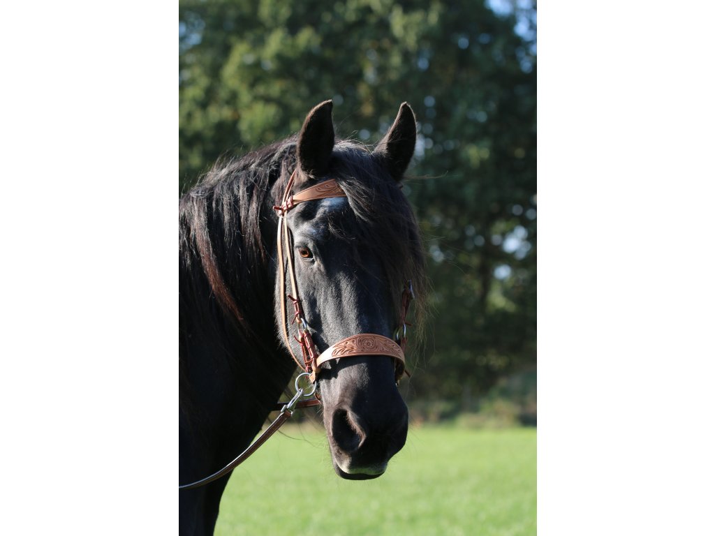 Westernová bezudidlová uzdečka Diego od značky F.R.A. je vyrobena z kvalitní argentinské kůže. Nánosník a nátylník jsou anatomicky tvarované. Uzdečka je ozvláštněna zdobným gravírováním na nánosníku a čelence, zdobena je kontrastními řemínky z kůže. Délku podhrdelníku a lícnic lze upravovat pouze na jedné straně. Uzdečka je dodávána s dělenými koženými otěžemi s karabinami. V rámci bezudidlového diagramu F.R.A. spadá pod číslo 3.