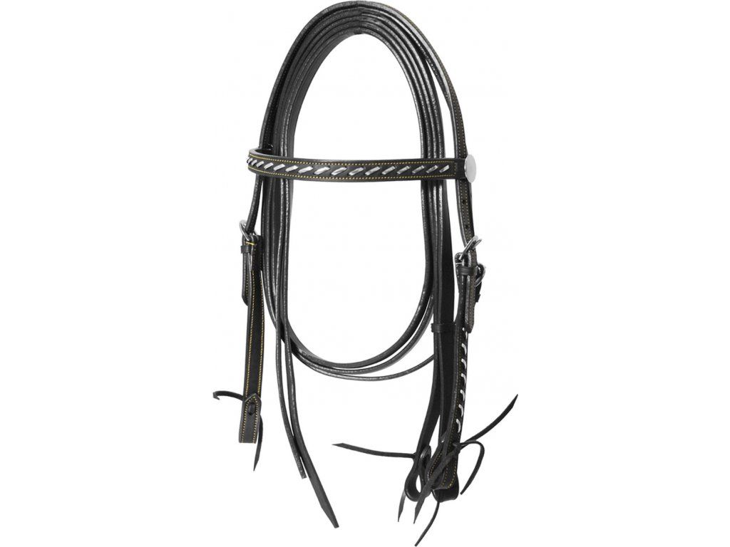 Westernová uzdečka vyrobena z kvalitní kůže. Vybavena klasickou rovnou čelenkou. Čelenka a lícnice mají stříbrné zdobení. Dodávána s koženými otěžemi. Dostupná také v hnědé barvě. Ve velikostech Shetland, Pony a Full.