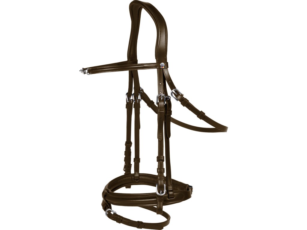 Elegantní uzdečka s anglickým kombinovaným nánosníkem a anatomicky tvarovaným nátylníkem. Anatomický nátylník pomáhá rovnoměrně rozložit tlak a zvyšuje komfort při nošení. Nánosník i nátylník jsou měkce podšité, což minimalizuje riziko otlaků. Uzdečka je doplněna rovnou čelenkou zdobenou detailem udidla. Odnímatelný podbradní řemínek umožňuje přizpůsobení podle individuálních potřeb koně. Kování z nerezové oceli zajišťuje dlouhou životnost a odolnost vůči korozi. Součástí balení jsou odpovídající otěže o šířce 19 mm.