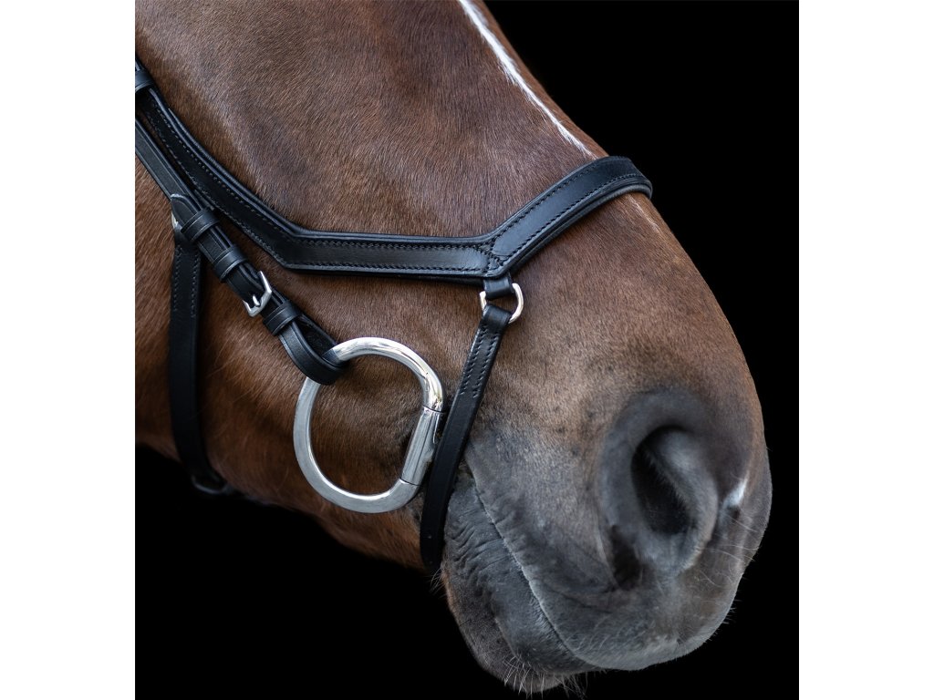Kvalitní anatomická uzdečka, která zajišťuje klidnou polohu udidla. Krátký nánosník je umístěn na středu nosní kosti, tak aby se minimalizoval tlak na citlivé nervové dráhy, cévy a kostnaté oblasti na nosu a lícních kostech. Anatomický nátylník poskytuje dostatek prostoru pro uši a zároveň disponuje mezerou uprostřed, díky které nedochází k tlaku na zátylek. Nátylník a nánosník jsou vybaveny měkkým polstrováním. Kování je ve stříbrné barvě a je vyrobeno z nerezové oceli. Dodáváno s 19mm otěžemi.
