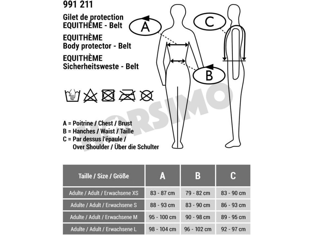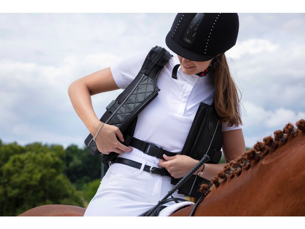 Bezpečnostní vesta Belt je navržena pro maximální ochranu jezdce a zároveň pro komfort při nošení a maximální volnost pohybu. Díky výplni z vysoce husté pěny poskytuje spolehlivou ochranu trupu a páteře při pádu, přitom zůstává velmi lehká, měkká a poddajná. Vesta se zapíná pomocí předního zipu a je vybavena nastavitelnými popruhy na bocích a ramenou se suchým zipem, které umožňují přesné přizpůsobení postavě. Plně kryté boční panely zvyšují úroveň ochrany citlivých partií. Vnitřní podpůrný pás s přezkou pomáhá udržet vestu stabilně na svém místě i při aktivním pohybu. Vnější textilní potah je odnímatelný a určený k ručnímu praní. Samotná ochranná výplň zůstává bezpečně uzavřena uvnitř vesty. Vesta splňuje přísné bezpečnostní normy EN 13158:2009 Level 3 a BETA Level 3, které jsou určeny pro vesty používané v jezdeckém sportu.