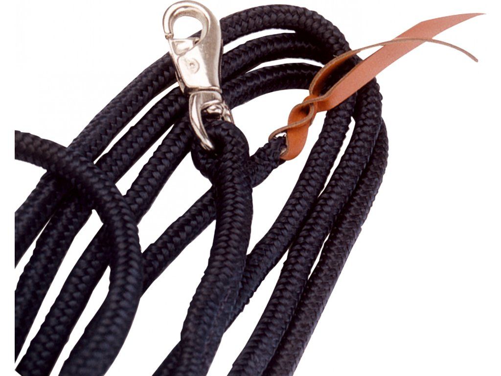 Pevné a velmi příjemné vodítko, které je ideální pro práci ze země. Vodítko je vyrobené z odolného materiálu se stříbrnou, otočnou "Bull Snap" karabinou s koženým zakončením. Průměr: 1,8cm, délka: 3,7m. K dispozici ve více barvách.