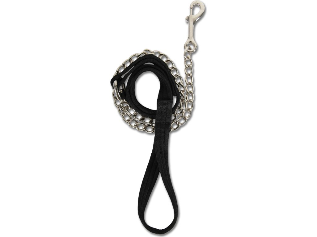 Příjemně měkké vodítko se stříbrným, lesklým řetězem s karabinou. Celková délka 165 cm, popruh 90 cm, řetízek 75 cm.