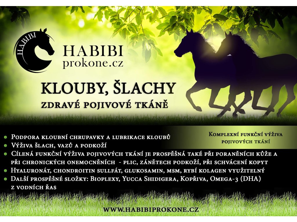 VÝPRODEJ: Expirace 04/25. KLOUBY, ŠLACHY, KŮŽE, HOJENÍ RAN, POJIVA. Vhodné pro koně, psy a kočky. Nejkomplexnější receptura Habibi s příznivými účinky na pojivové tkáně. Slouží jako výživa a lubrikace kloubů, šlach, vazů- např. jako součást prevence zátěžového poranění pohybového aparátu sportovcům, mladým jedincům v období rychlejšího růstu, starším jedincům s horší hybností pohybového aparátu, dále po poraněních, při chronických kloubních onemocněních a po operacích. Vyživuje, zpevňuje a ,,omlazuje" podkoží a podporuje hojení špatně hojících se ran.