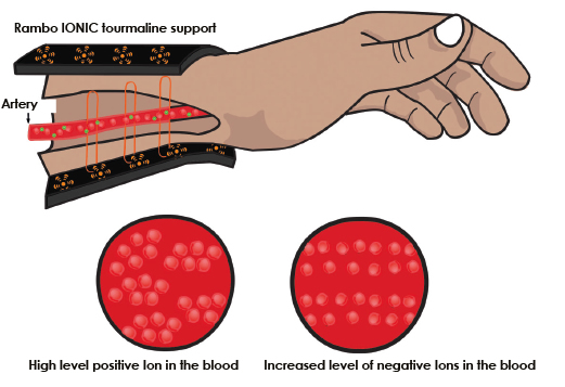 Unikátní regenerační a terapeutické pomůcky Rambo® IONIC s krystaly Turmalínu. Turmalín vyzařuje negativní ionty do těla. Negativní ionty mají velmi blahodárné účinky na lidský organismus. Podporují a stimulují kardiovaskulární a endokrinní systém těla. Zvýšují krevní oběh, což vede ke stimulaci metabolismu. Zvyšují přísun kyslíku a živin do buněk a tkání. Zároveň přivádí rychleji kyslík do mozku a pomáhají tak zlepšit koncentraci. Zajišťují obnovu pH, snížení krevního tlaku a efektivnější odstranění toxinů z těla. Negativní ionty přispívají k posílení produkce kolagenu.