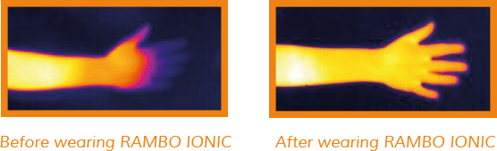 Z termografických testů lze vidět, že Rambo® IONIC výrazně zvyšuje cirkulaci. Zvýšení cirkulace může napomoci tělu se zotavit ze zranění a může pomoci jedincům, kteří trpí zpomaleným oběhovým systémem.